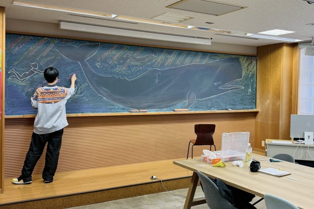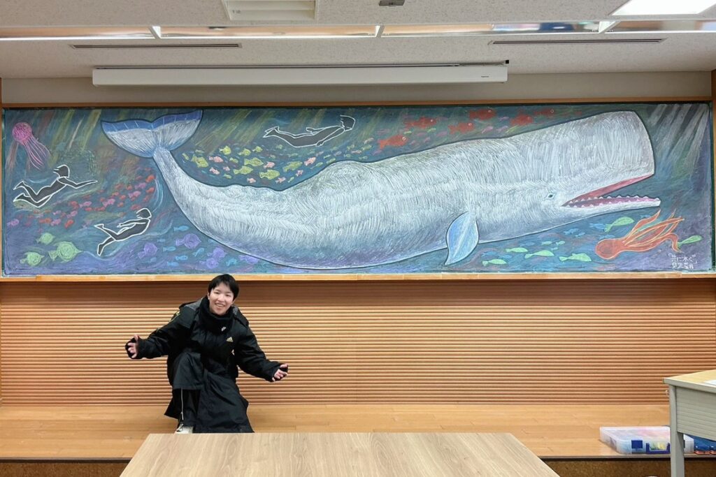 横長の大きな黒板に悠々と泳ぐくじらと光の差し込む様子、チョークのみで描かれたとは思えない鮮やかさに、見に来られた皆さんも驚きの声を上げていました。